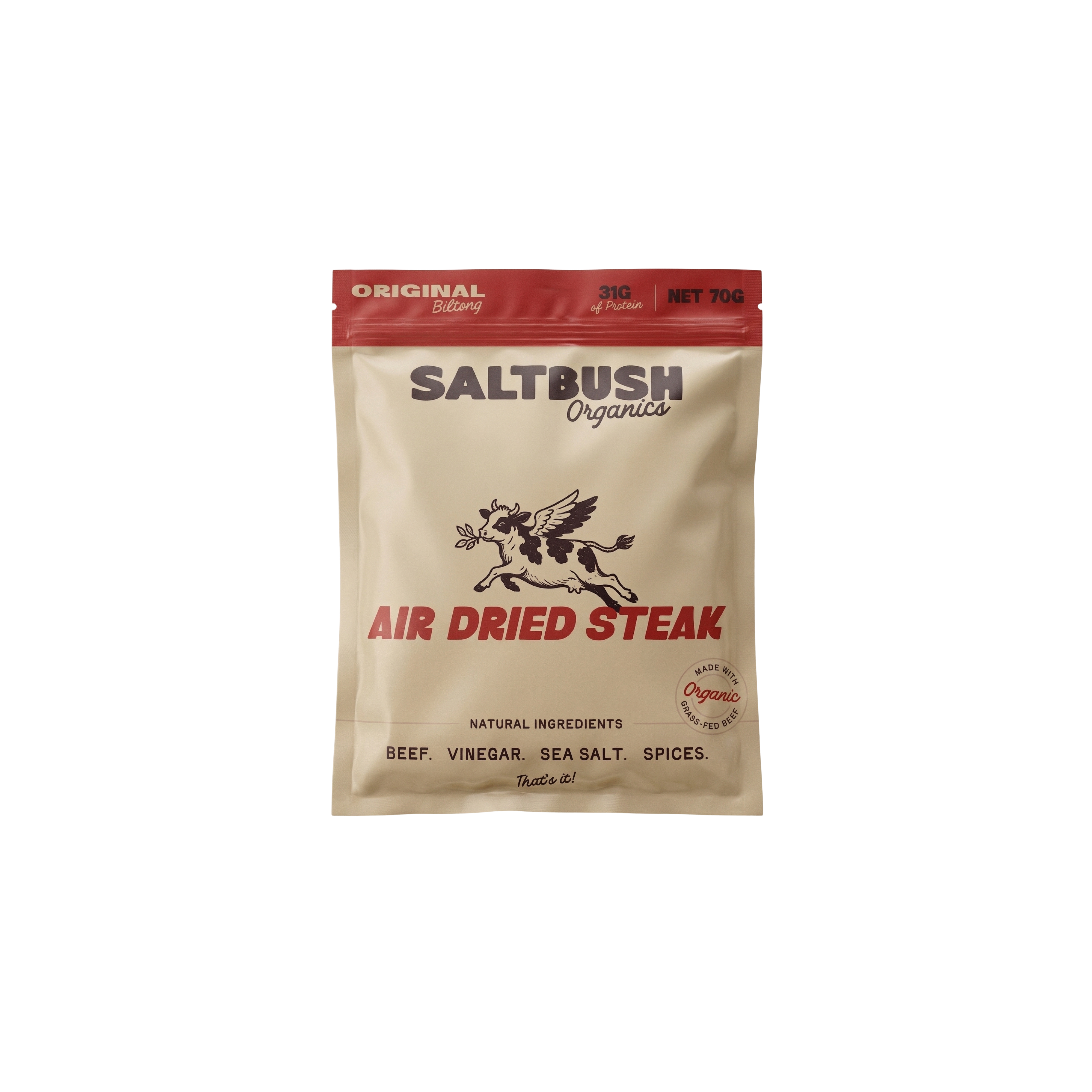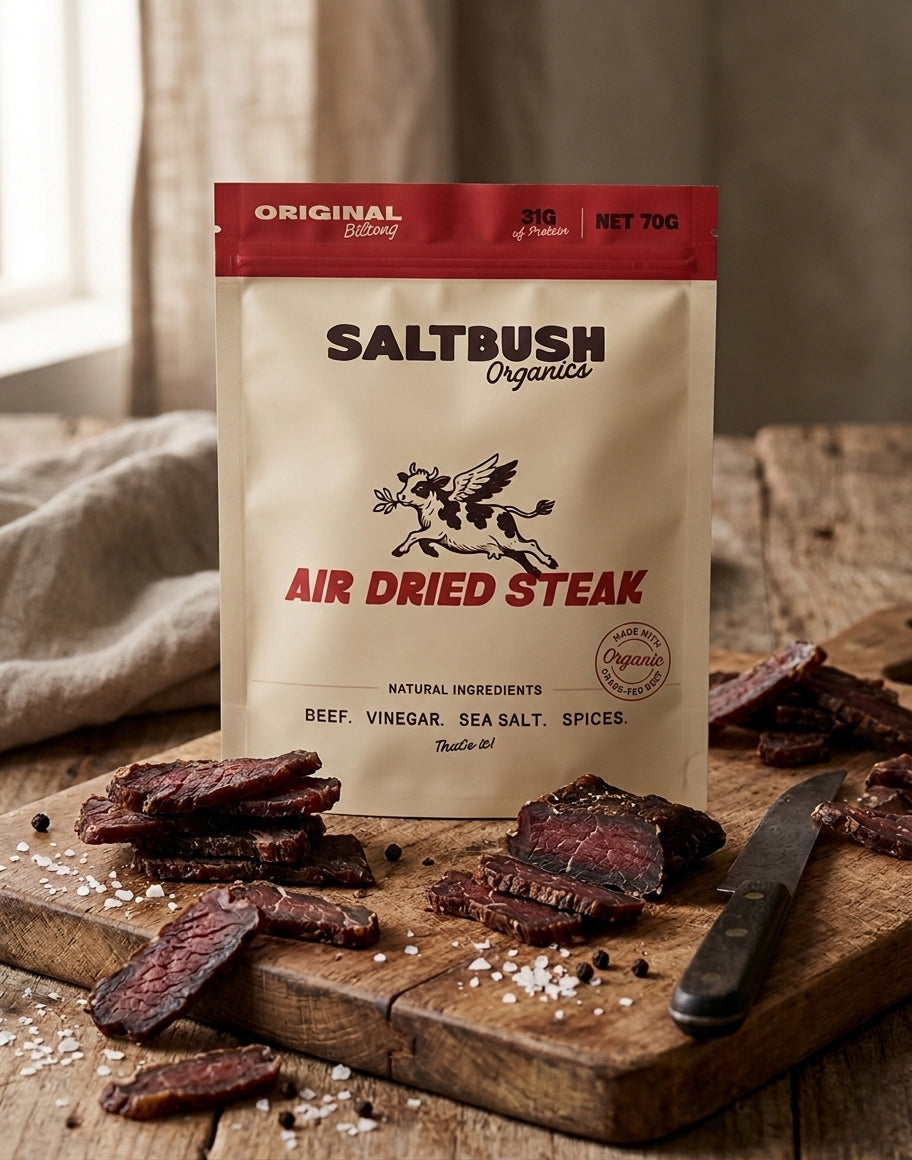 At Saltbush Organics, we focus on the fundamentals: real ingredients, clean nutrition, and exceptional quality. Our biltong is made using 100% Australian organic grass-fed beef, seasoned simply with salt, vinegar and spices, then slowly air-dried for flavour and tenderness. We avoid added sugar, preservatives, and unnecessary fillers. The result is a high-protein snack that’s simple, satisfying, and easy to trust.